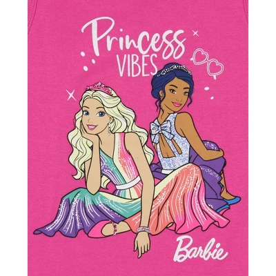 - CLASSIC CHARACTER DESIGN – This Barbie tight-fit pajama sleep set-top features Barbie and her friend with tiaras and the words “Princess Vibes” above them! The bottoms feature a striped print with the iconic classic Barbie logo on them.