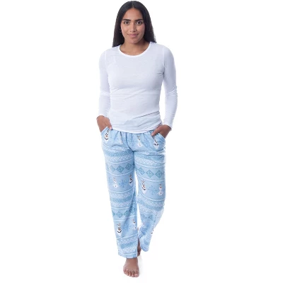 - CLASSIC CHARACTER DESIGN – These pants have a sweater print of Olaf in a faux embroider type design, along with snowflakes, a closeup of his face, and a body shot all against a soft blue background.