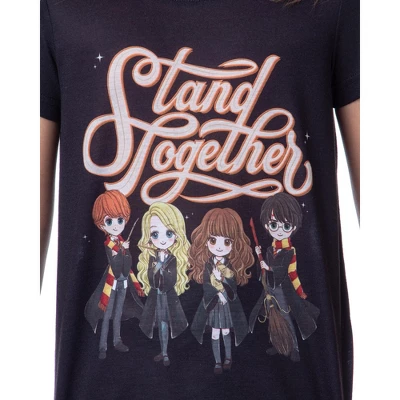 - CLASSIC CHARACTER DESIGN – This pajama set-top features the phrase “Stand Together” along with several iconic characters from the Harry Potter series–Ron Weasley, Hermione Granger, Harry Potter (the golden trio) along with Luna Lovegood in a cute cartoon design! The shorts feature the same characters in an all-over print.