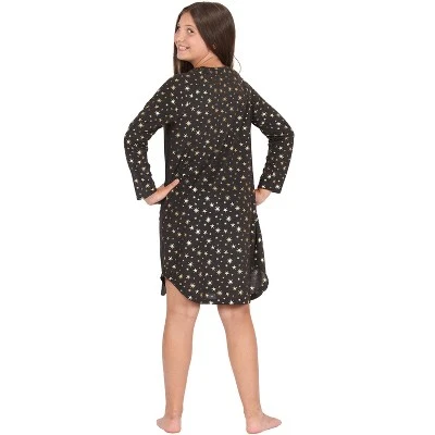Charms and Chibis! This Harry Potter Hermoine Chibi Charms Logo House Crest Raglan Pajama Gown is a cute and comfy addition to any Harry Potter fan’s wardrobe. The long sleeve pajama nightgown features Harry Potter, Ron Weasley, Hermione Granger and Hedwig the Owl designed in Chibi style artwork on the front. The long sleeves and back are covered in a gold foil star pattern that shines. For questions regarding sizing, please refer to size chart.