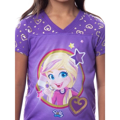 - CLASSIC CHARACTER DESIGN – This Polly Pocket jogger set features Polly Pocket in her animated series style, holding her purple heart magic locket. It has the Polly Pocket logo under her, and the pants feature an all-over gold foil heart print with the same purple background as the shirt.
