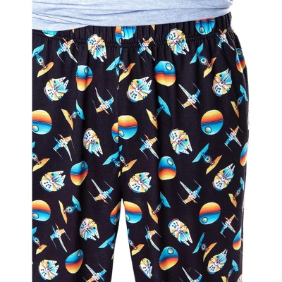 - COLORFUL LINEAR-GRADIENT GRAPHICS – The front of the long sleeve top features a Star Wars 1977 design on a Death Star that is done in a colorful linear-gradient style design. The sleep pants have an excellent allover design done in the same style, with Millennium Falcons, Tie-Fighters, and X-Wing spaceships, along with more Death Stars.